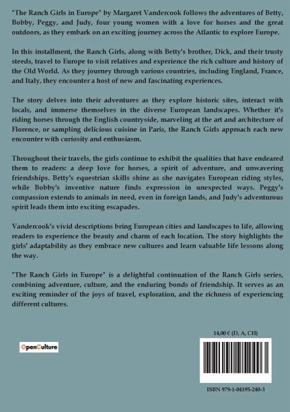 "The Ranch Girls in Europe" by Margaret Vandercook follows the adventures of Betty, Bobby, Peggy, and Judy, four young women with a love for horses and the great outdoors, as they embark on an exciting journey across the Atlantic to explore Europe. In this installment, the Ranch Girls, along with Betty's brother, Dick, and their trusty steeds, travel to Europe to visit relatives and experience the rich culture and history of the Old World. As they journey through various countries, including England, France, and Italy, they encounter a host of new and fascinating experiences. The story delves into their adventures as they explore historic sites, interact with locals, and immerse themselves in the diverse European landscapes. Whether it's riding horses through the English countryside, marveling at the art and architecture of Florence, or sampling delicious cuisine in Paris, the Ranch Girls approach each new encounter with curiosity and enthusiasm. Throughout their travels, the girls continue to exhibit the qualities that have endeared them to readers: a deep love for horses, a spirit of adventure, and unwavering friendships. Betty's equestrian skills shine as she navigates European riding styles, while Bobby's inventive nature finds expression in unexpected ways. Peggy's compassion extends to animals in need, even in foreign lands, and Judy's adventurous spirit leads them into exciting escapades. Vandercook's vivid descriptions bring European cities and landscapes to life, allowing readers to experience the beauty and charm of each location. The story highlights the girls' adaptability as they embrace new cultures and learn valuable life lessons along the way. "The Ranch Girls in Europe" is a delightful continuation of the Ranch Girls series, combining adventure, culture, and the enduring bonds of friendship. It serves as an exciting reminder of the joys of travel, exploration, and the richness of experiencing different cultures.