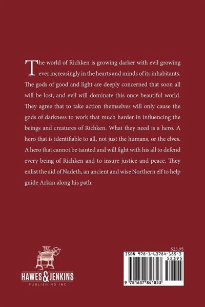 The world of Richken is growing darker with evil growing ever increasingly in the hearts and minds of its inhabitants. The gods of good and light are deeply concerned that soon all will be lost, and evil will dominate this once beautiful world. They agree that to take action themselves will only cause the gods of darkness to work that much harder in influencing the beings and creatures of Richken. What they need is a hero. A hero that is identifiable to all, not just the humans, or the elves. A hero that cannot be tainted and will fight with his all to defend every being of Richken and to insure justice and peace. They enlist the aid of Nadeth, an ancient and wise Northern elf to help guide Arkan along his path.