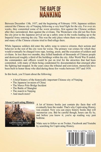 If you want to discover the captivating history of the Second Sino-Japanese War, then keep reading... Many people in the West look upon the Second Sino-Japanese War, which took place in the 1930s and 1940s, as a sort of sideshow to the larger Second World War, but there is no separating the two. Imagine the Pacific War, the theater of World War II that took place in the Pacific. If the Japanese were not busy fighting on another front, they would have had millions of more troops available to fight the Americans and the British. In all likelihood, World War II would have ended the same way, but it would have taken much longer and cost that many more lives. To understand the conflict between these two Asian powers, we have to travel back in time quite a ways, for the story of what is known by many as the Second Sino-Japanese War is long and rooted deep in history. In The Second Sino-Japanese War: A Captivating Guide to Military Conflict That Began between China and Japan, Including Events Such as the Japanese Invasion of Manchuria and the Nanjing Massacre, you will discover topics such asThe Roots of the Conflict Japan before the War Manchuria/Manchukuo China Proper Another "Incident" The Opponents The Tragedy of Nanjing They Were Expendable The War Drags On Horrors Mostly Unknown Friends And much, much more! So if you want to learn more about the Second Sino-Japanese War, scroll up and click the "add to cart" button!