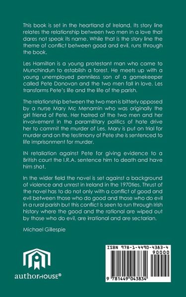 This book is set in the heartland of Ireland. Its story line relates the relationship between two men in a love that dares not speak its name. While that is the story line the theme of conflict between good and evil, runs through the book. Les Hamilton is a young protestant man who came to Munchindun to establish a forest. He meets up with a young unemployed penniless son of a gamekeeper called Pete Donovan and the two men fall in love. Les transforms Pete's life and the life of the parish. The relationship between the two men is bitterly opposed by a nurse Mary Mc Menamin who was originally the girl friend of Pete. Her hatred of the two men and her involvement in the paramilitary politics of hate secraranism and bigotry drive her to commit the murder of Les. Mary is put on trial for murder and on the testimony of Pete she is sentenced to life imprisonment for murder. IN retaliation against Pete f or giving evidence to a British court the I.R.A. sentence him to death and have him shot. In the wider field the novel is set against a background of violence and unrest in Ireland in the 1970ties. The thrust of the novel has to do not only with a conflict of good and evil between those who do good and those who do evil in a rural parish but this conflict is seen to run through Irish history where the good and the rational are wiped out by those who do evil, are irrational and are sectarian. Michael Gillespie