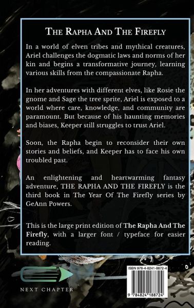 In a world of elven tribes and mythical creatures, Ariel challenges the dogmatic laws and norms of her kin and begins a transformative journey, learning various skills from the compassionate Rapha. In her adventures with different elves, like Rosie the gnome and Sage the tree sprite, Ariel is exposed to a world where care, knowledge, and community are paramount. But because of his haunting memories and biases, Keeper still struggles to trust Ariel. Soon, the Rapha begin to reconsider their own stories and beliefs, and Keeper has to face his own troubled past. An enlightening and heartwarming fantasy adventure, THE RAPHA AND THE FIREFLY is the third book in The Year Of The Firefly series by GeAnn Powers. This is the large print edition of The Rapha And The Firefly , with a larger font / typeface for easier reading.