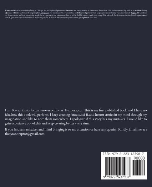Harry Miller is a 16-year-old boy living in Chicago. He is a big fan of ginormous dinosaurs and always wanted to know more about them. This excitement one day leads to an accident during a Jurassic exhibition which ends up giving him superpowers. He tries to use his powers to find his kidnapped parents while keeping his secret identity. He named himself Raptor. He also finds out that a scientist had been kidnapping people for an experiment and tries to save them as well as find his parents which went wrong. That led to all the victims turning into horrifying creatures. Now, Raptor must save all the victims as well as his parents. Will he be able to save everyone without getting killed? Find out!