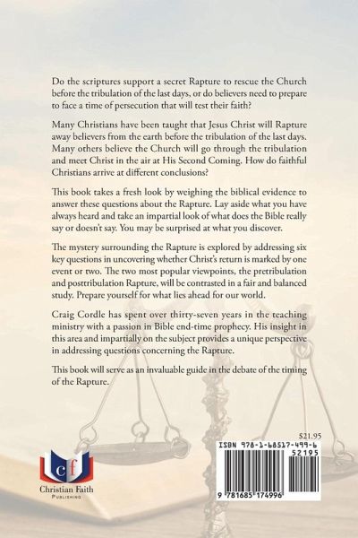 Do the scriptures support a secret Rapture to rescue the Church before the tribulation of the last days, or do believers need to prepare to face a time of persecution that will test their faith? Many Christians have been taught that Jesus Christ will Rapture away believers from the earth before the tribulation of the last days. Many others believe the Church will go through the tribulation and meet Christ in the air at His Second Coming. How do faithful Christians arrive at different conclusions? This book takes a fresh look by weighing the biblical evidence to answer these questions about the Rapture. Lay aside what you have always heard and take an impartial look of what does the Bible really say or doesn't say. You may be surprised at what you discover. The mystery surrounding the Rapture is explored by addressing six key questions in uncovering whether Christ's return is marked by one event or two. The two most popular viewpoints, the pretribulation and posttribulation Rapture, will be contrasted in a fair and balanced study. Prepare yourself for what lies ahead for our world. Craig Cordle has spent over thirty-seven years in the teaching ministry with a passion in Bible end-time prophecy. His insight in this area and impartially on the subject provides a unique perspective in addressing questions concerning the Rapture. This book will serve as an invaluable guide in the debate of the timing of the Rapture.
