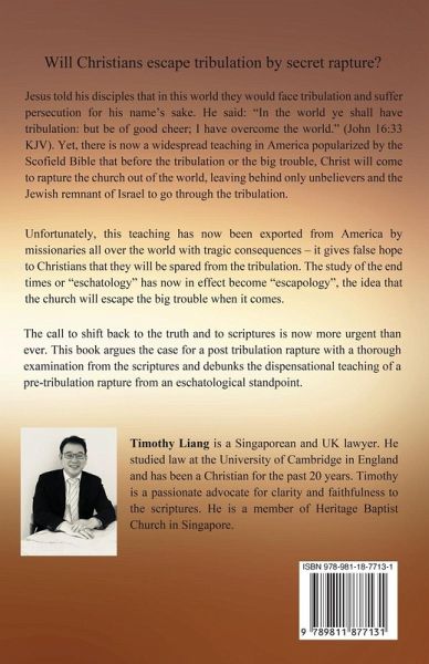 Exposing the error of the pre-tribulation rapture doctrine, The Rapture: The Case for a Post Tribulation Rapture in the End Times is a compelling, concisely written and easy to understand book for all Christians that explains why the rapture occurs after the tribulation - Christians are to go through the big trouble and suffer persecution before the Second Coming This book is written for all Christians to easily understand why the pre-tribulation rapture is unbiblical. It examines the historical roots of this dispensational pre-tribulation teaching starting with John Nelson Darby and demonstrates why the bible teaches that the church will go through tribulation in the future. It is a compelling read for all Christians and students of eschatology. Why this matters is precisely because it affects the way the church should prepare for the future - should Christians put their hopes in a rapture that takes them out of tribulation, or should Christians get ready to suffer tribulation and persecution when the Antichrist comes in the future? It is tragic that the study of eschatology has now become "escapology", the idea that before the big trouble the church will be raptured into heaven, leaving behind unbelievers and Israel to go through the tribulation. This book delves into scripture and cuts through the heart of the pre tribulation rapture teaching with remarkable precision, debunking some of the most common arguments that support the pre tribulational rapture. In particular, the book will focus on:The historical roots of the pre-tribulation rapture doctrine Biblical arguments for a post tribulation rapture Debunking common pre-tribulation rapture arguments How should Christians prepare for the coming tribulation This book debunks all the major arguments used to support a pre-tribulation rapture and explains why, from a biblical perspective, a post tribulation rapture is in line with scripture. The book is designed to be simple, concise and easy to read for all Christians and students of eschatology.