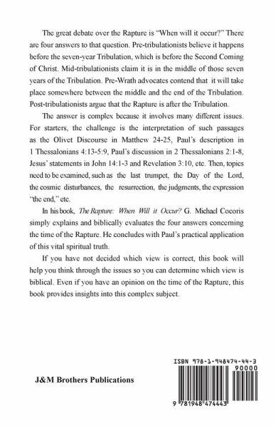An explanation and biblical evaluation of four answers The great debate over the Rapture is "When will it occur?" There are four answers to that question. Pre-tribulationists believe it happens before the seven-year Tribulation, which is before the Second Coming of Christ. Mid-tribulationists claim it is in the middle of those seven years of the Tribulation. Pre-Wrath advocates contend that it will take place somewhere between the middle and the end of the Tribulation. Post-tribulationists argue that the Rapture is after the Tribulation. The answer to this question is complex because it involves many different issues. For starters, the challenge is the interpretation of such passages as the Olivet Discourse in Matthew 24-25, Paul's description in 1 Thessalonians 4:13-5:9, Paul's discussion in 2 Thessalonians 2:1-8, Jesus' statements in John 14:1-3 and Revelation 3:10, etc. Then, some topics must be examined, such as the last trumpet, the Day of the Lord, cosmic disturbances, the resurrection, the judgments, the expression "the end," etc. In the Rapture Question: When Will it Occur, G. Michael Cocoris simply explains and biblically evaluates each of the four answers concerning the time of the Rapture. He concludes with Paul's practical application of this vital spiritual truth.