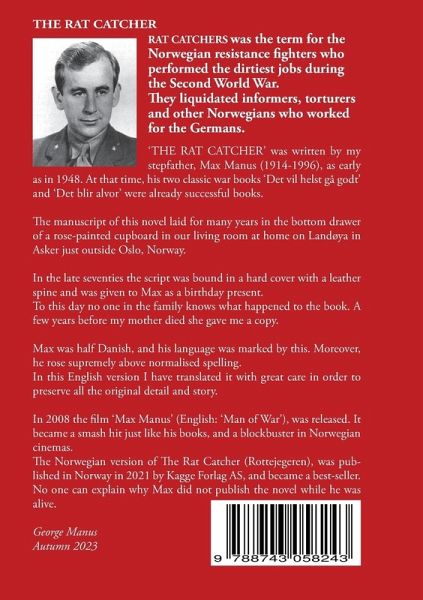 RAT CATCHERS was the term for the Norwegian resistance fighters who performed the dirtiest jobs during the Second World War. They liquidated informers, torturers and other Norwegians who worked for the Germans. "THE RAT CATCHER" was written by my stepfather, Max Manus (1914-1996), as early as in 1948. At that time, his two classic war books "Det vil helst gå godt" and "Det blir alvor" were already successful books. The manuscript of this novel laid for many years in the bottom drawer of a rose-painted cupboard in our living room at home on Landøya in Asker just outside Oslo, Norway. In the late seventies the script was bound in a hard cover with a leather spine and was given to Max as a birthday present. To this day no one in the family knows what happened to the book. A few years before my mother died she gave me a copy. Max was half Danish, and his language was marked by this. Moreover, he rose supremely above normalised spelling. In this English version I have translated it with great care in order to preserve all the original detail and story. In 2008 the film "Max Manus" (English: "Man of War"), was released. It became a smash hit just like his books, and a blockbuster in Norwegian cinemas. The Norwegian version of The Rat Catcher (Rottejegeren), was published in Norway in 2021 by Kagge Forlag AS, and became a best-seller. No one can explain why Max did not publish the novel while he was alive.
