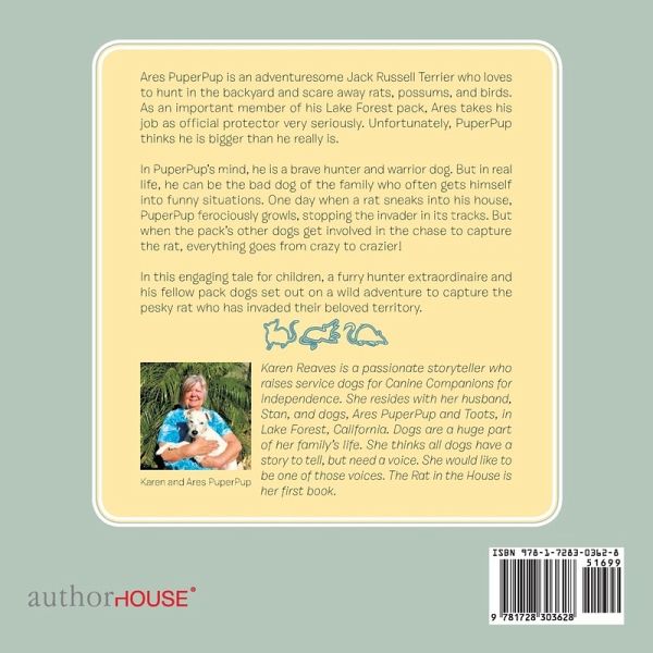 Ares PuperPup is an adventuresome Jack Russell Terrier who loves to hunt in the backyard and scare away rats, possums, and birds. As an important member of his Lake Forest pack, Ares takes his job as official protector very seriously. Unfortunately, PuperPup thinks he is bigger than he really is. In PuperPup's mind, he is a brave hunter and warrior dog. But in real life, he can be the bad dog of the family who often gets himself into funny situations. One day when a rat sneaks into his house, PuperPup ferociously growls, stopping the invader in its tracks. But when the pack's other dogs get involved in the chase to capture the rat, everything goes from crazy to crazier! In this engaging tale for children, a furry hunter extraordinaire and his fellow pack dogs set out on a wild adventure to capture the pesky rat who has invaded their beloved territory.