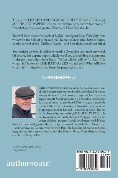This is the LEAKED AND ALMOST FULLY REDACTED copy of "THE RAT PAPERS ". Contained within is the sworn testimony of Benedict, perhaps our greatest Traitor, or Hero. You decide. You will learn about the pack of highly-intelligent New York City Rats who, with the help of some odd-ball human mercenaries, have connived to take control of the "Civilized" world - and how their plot almost failed. Some might say what is told here reveals a Dystopian version of our world. Of course, this depends upon which world you are residing in at present. In the past, you might have heard: "What will be, will be." ...And "It is what it is." However, THE RAT PAPERS will tell you "What will be is what it is." ...And why you better be prepared to duck.
