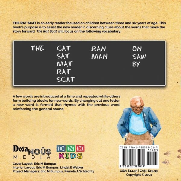 English: African American Man THE RAT SCAT is an early reader focused on children between three and six years of age. This book's purpose is to assist the new reader in discerning clues about the words that move the story forward. The Rat Scat will focus on the following vocabulary: The, the cat, sat, mat, rat, scat ran, man on, saw, by A few words are introduced at a time and repeated while others form building blocks for new words. By changing out one letter, a new word is formed that rhymes with the previous word, reinforcing the general sound.