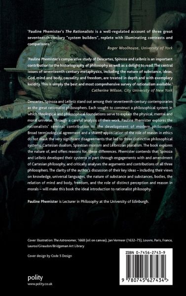 Descartes, Spinoza and Leibniz stand out among their seventeenth-century contemporaries as the great rationalist philosophers. Each sought to construct a philosophical system in which theological and philosophical foundations serve to explain the physical, mental and moral universe. Through a careful analysis of their work, Pauline Phemister explores the rationalists seminal contribution to the development of modern philosophy. Broad terminological agreement and a shared appreciation of the role of reason in ethics do not mask the very significant disagreements that led to three distinctive philosophical systems: Cartesian dualism, Spinozan monism and Leibnizian pluralism. The book explores the nature of, and offers reasons for, these differences. Phemister contends that Spinoza and Leibniz developed their systems in part through engagements with and amendment of Cartesian philosophy, and critically analyses the arguments and contributions of all three philosophers. The clarity of the authors discussion of their key ideas including their views on knowledge, universal languages, the nature of substance and substances, bodies, the relation of mind and body, freedom, and the role of distinct perception and reason in morals will make this book the ideal introduction to rationalist philosophy.