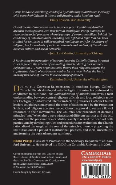 During the Counter-Reformation in southern Europe, Catholic Church officials developed rules to legitimize miracles performed by candidates to sainthood. The Rationalization of Miracles uncovers a tacit understanding between central religious officials and local religious activists. Each group had a vested interest in declaring miracles: Catholic Church leaders sought legitimacy in the wake of the crisis of faith created by the Protestant Schism and religious acolytes needed Church approval to secure a flow of resources to their movements. The Church's new procedure of deeming miracles 'true' when there were witnesses of different statuses and the acts occurred in the presence of a candidate's acolyte served the needs of both parties. And by developing rules and procedures for evaluating miracles, the Church rationalized the magic at the root of the miracles, thereby propelling the institution out of a period of institutional, political and social uncertainty and forming the basis of modern sainthood.