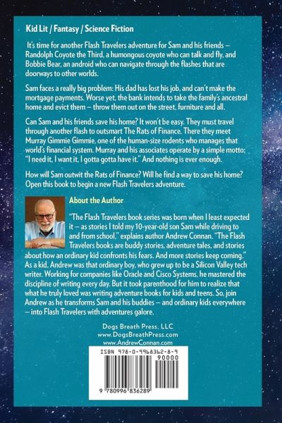 It's time for another Flash Travelers adventure for Sam and his friends - Randolph Coyote the Third, a humongous coyote who can talk and fly, and Bobbie Bear, an android who can navigate through the flashes that are doorways to other worlds. Sam faces a really big problem: His dad has lost his job, and can't make the mortgage payments. Worse yet, the bank intends to take the family's ancestral home and evict them - throw them out on the street, furniture and all. Can Sam and his friends save his home? It won't be easy. They must travel through another flash to outsmart The Rats of Finance. There they meet Murray Gimmie Gimmie, one of the human-size rodents who manages that world's financial system. Murray and his associates operate by a simple motto: "I need it, I want it, I gotta gotta have it." And nothing is ever enough. How will Sam outwit the Rats of Finance? Will he find a way to save his home? Open this book to begin a new Flash Travelers adventure.