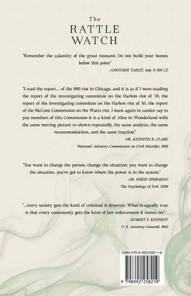 In 1658, one captain and eight watchmen known as the Rattle Watch walked the streets of the Dutch colony of New Amsterdam, an area we recognize today as Wall Street to the north and Battery Park to the south, New York City. These nine men were issued green lanterns and wooden rattles to be used as an early warning system for the new settlers in this new land. Throughout this book we look at the research of the social sciences from the point of view of the community, academics and practitioners. Research on social cohesion, group dynamics, human behavior, motivation, to mention a few. Further reviewing the intrinsic value of neighborhoods, how in times where the community has abdicated their obligation, it has led to abuse of power and corruption. The Rattle Watch will transport the reader through the history of policing recognizing the good, and the bad, which can tarnish an institution that is a vital member of society. Where police officers opened the first soup kitchen for the hungry, provided rooms for the unhoused, inspected boilers for safety; Sir Robert Peel said, "...the police are the public and the public are the police." To separate one from another eliminates the necessary guardrails for safe communities. Police Science has established evidence-based strategies that work if implemented. The role of Social Sciences in the field of policing has been advocated for over one hundred years by earlier pioneers of the profession, Theodore Roosevelt, August Vollmer, and more recently by George Kelling, James Q. Wilson, Herman Goldstein, William Bratton. Through the social sciences, psychology, sociology, criminology, and police science, we look back at the history of policing and its relations to the community it serves. We look forward with the lessons of the past to implement the evidence-based strategies that work and identify the tactics and strategies that harm our communities. Most important of all, the Rattle Watch, since its inception, has been an early warning system to alert the community of risk, danger, and crime.
