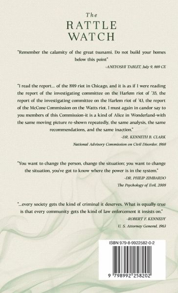 In 1658, one captain and eight watchmen known as the Rattle Watch walked the streets of the Dutch colony of New Amsterdam, an area we recognize today as Wall Street to the north and Battery Park to the south, New York City. These nine men were issued green lanterns and wooden rattles to be used as an early warning system for the new settlers in this new land. Throughout this book we look at the research of the social sciences from the point of view of the community, academics and practitioners. Research on social cohesion, group dynamics, human behavior, motivation, to mention a few. Further reviewing the intrinsic value of neighborhoods, how in times where the community has abdicated their obligation, it has led to abuse of power and corruption. The Rattle Watch will transport the reader through the history of policing recognizing the good, and the bad, which can tarnish an institution that is a vital member of society. Where police officers opened the first soup kitchen for the hungry, provided rooms for the unhoused, inspected boilers for safety; Sir Robert Peel said, "...the police are the public and the public are the police." To separate one from another eliminates the necessary guardrails for safe communities. Police Science has established evidence-based strategies that work if implemented. The role of Social Sciences in the field of policing has been advocated for over one hundred years by earlier pioneers of the profession, Theodore Roosevelt, August Vollmer, and more recently by George Kelling, James Q. Wilson, Herman Goldstein, William Bratton. Through the social sciences, psychology, sociology, criminology, and police science, we look back at the history of policing and its relations to the community it serves. We look forward with the lessons of the past to implement the evidence-based strategies that work and identify the tactics and strategies that harm our communities. Most important of all, the Rattle Watch, since its inception, has been an early warning system to alert the community of risk, danger, and crime.