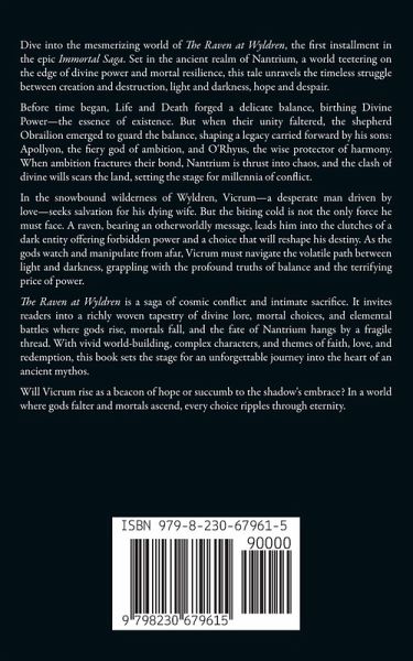 Dive into the mesmerizing world of The Raven at Wyldren, the first installment in the epic Immortal Saga. Set in the ancient realm of Nantrium, a world teetering on the edge of divine power and mortal resilience, this tale unravels the timeless struggle between creation and destruction, light and darkness, hope and despair. Before time began, Life and Death forged a delicate balance, birthing Divine Power-the essence of existence. But when their unity faltered, the shepherd Obrailion emerged to guard the balance, shaping a legacy carried forward by his sons: Apollyon, the fiery god of ambition, and O'Rhyus, the wise protector of harmony. When ambition fractures their bond, Nantrium is thrust into chaos, and the clash of divine wills scars the land, setting the stage for millennia of conflict. In the snowbound wilderness of Wyldren, Vicrum-a desperate man driven by love-seeks salvation for his dying wife. But the biting cold is not the only force he must face. A raven, bearing an otherworldly message, leads him into the clutches of a dark entity offering forbidden power and a choice that will reshape his destiny. As the gods watch and manipulate from afar, Vicrum must navigate the volatile path between light and darkness, grappling with the profound truths of balance and the terrifying price of power. The Raven at Wyldren is a saga of cosmic conflict and intimate sacrifice. It invites readers into a richly woven tapestry of divine lore, mortal choices, and elemental battles where gods rise, mortals fall, and the fate of Nantrium hangs by a fragile thread. With vivid world-building, complex characters, and themes of faith, love, and redemption, this book sets the stage for an unforgettable journey into the heart of an ancient mythos. Will Vicrum rise as a beacon of hope or succumb to the shadow's embrace? In a world where gods falter and mortals ascend, every choice ripples through eternity.