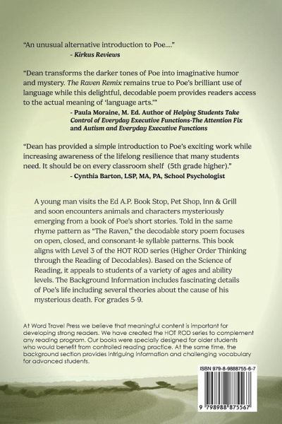 A young man visits the Ed A.P. Book Stop, Pet Shop, Inn & Grill and soon encounters animals and characters mysteriously emerging from a book of Poe's short stories. Told in the same rhyme pattern as "The Raven," the decodable story poem focuses on open, closed, and consonant-le syllable patterns. This book aligns with Level 3 of the HOT ROD series (Higher Order Thinking through the Reading of Decodables). Based on the Science of Reading, it appeals to students of a variety of ages and ability levels. The Background Information includes fascinating details of Poe's life including several theories about the cause of his mysterious death. For grades 5-9. At Word Travel Press, we believe that meaningful content is important for developing strong readers. We have created the HOT ROD series to complement any reading program. Our books were specially designed for older students who would benefit from controlled reading practice. Our stories and poems help students develop Higher Order Thinking through the Reading of Decodables. Students are exposed to higher-level vocabulary and sentence structure through a process called Pair and Share Reading. For information about the scope and sequence of HOT ROD and the progression from basic to advanced decoding visit www.wordtravelpress.com. On the website, each book is supplemented with additional Higher Order Thinking questions, reproducible materials, games, and activities.