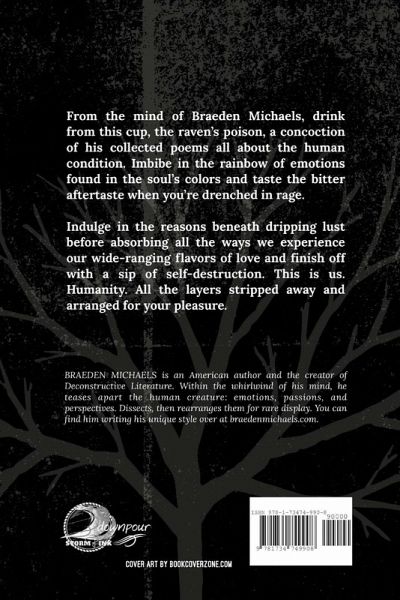 From the mind of Braeden Michaels, drink from this cup, the raven's poison, a concoction of his collected poems all about the human condition. Imbibe in the rainbow of emotions found in the soul's colors and taste the bitter aftertaste when you're drenched in rage. Indulge in the reasons beneath dripping lust before absorbing all the ways we experience our wide-ranging flavors of love and finish off with a sip of self-destruction. This is us. Humanity. All the layers stripped away and arranged for your pleasure.