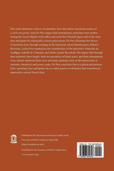 This study delineates a theory of epistolary lyric that refutes historical notions of a siecle sans poesie. Julia De Pree argues that monophonic, epistolary texts written during the Ancien Regime both reflect and resist the Classical legacy and at the same time anticipate the nineteenth-century prose poem. De Pree illustrates her theory of epistolary lyric through readings in the historical canon (Montesquieu, Diderot, Rousseau, Laclos) but emphasizes the contributions of the epistoliere: Francoise de Graffigny, Isabelle de Charriere, and Marie-Jeanne Riccoboni. She argues that through their relatively short length, their incorporation of blank space, and their monophonic voice, female-authored letter-texts articulate epistolary lyric at the intersection of narrative, theatrical, and poetic codes. De Pree concludes that as a plural and protean form, epistolary lyric anticipates the so-called poetic revolution(s) that transformed nineteenth-century French lyric.