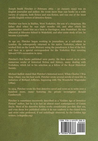 Joseph Smith Fletcher (7 February 1863 - 30 January 1935) was an English journalist and author. He wrote more than 230 books on a wide variety of subjects, both fiction and non-fiction, and was one of the most prolific English writers of detective fiction. Fletcher was born in Halifax, West Yorkshire, the son of a clergyman. His father died when he was eight months old, and after which his grandmother raised him on a farm in Darrington, near Pontefract. He was educated at Silcoates School in Wakefield, and after some study of law, he became a journalist. At age 20, Fletcher began working in journalism, as a sub-editor in London. He subsequently returned to his native Yorkshire, where he worked first on the Leeds Mercury using the pseudonym A Son of the Soil, and then as a special correspondent for the Yorkshire Post covering Edward VII's coronation in 1902. Fletcher's first books published were poetry. He then moved on to write numerous works of historical fiction and history, many dealing with Yorkshire, which led to his selection as a fellow of the Royal Historical Society. Michael Sadleir stated that Fletcher's historical novel, When Charles I Was King (1892), was his best work. Fletcher wrote several novels of rural life in imitation of Richard Jefferies, beginning with The Wonderful Wapentake (1894). In 1914, Fletcher wrote his first detective novel and went on to write over a hundred more, many featuring the private investigator Ronald Camberwell. Fletcher is sometimes incorrectly described as a "Golden Age of Detective Fiction" author, but he is in fact an almost exact contemporary of Conan Doyle. Most of his detective fiction works considerably pre-date that era, and even those few published within it do not conform to the closed form and strict rules professed, if not unfailingly observed, by the Golden Age writers. (wikipedia.org)