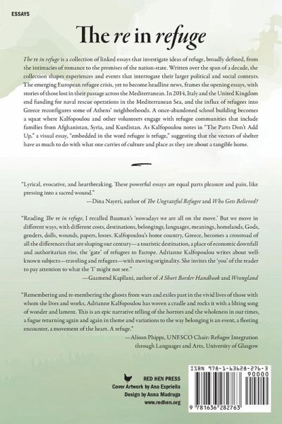 The re in refuge is a collection of linked essays joined with photographs that investigate ideas of refuge, broadly defined, from the intimacies of romance to the promises of the nation state. Written over the span of a decade, the collection shapes experiences and events that interrogate their larger political and social contexts. The emerging European refugee crisis, yet to become headline news, frames the opening essays, with stories of those lost in their passage across the Mediterranean. In 2014 Italy and the United Kingdom ended funding for naval rescue operations in the Mediterranean Sea, and the influx of refugees into Greece reconfigures some of Athens' neighborhoods. A once abandoned school building becomes a squat where Kalfopoulou and other volunteers engage with refugee communities that include families from Afghanistan, Syria, and Kurdistan. As Kalfopoulou notes in "The Parts Don't Add Up" a visual essay, “Embedded in the word refugee is refuge,” suggesting that the vectors of shelter have as much to do with what one carries of culture and place as they are about a tangible home.