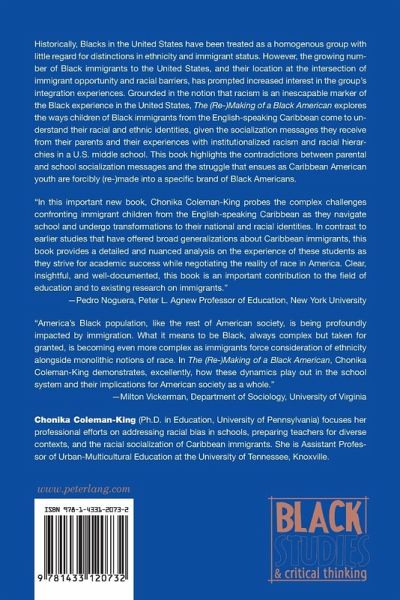 «America's Black population, like the rest of American society, is being profoundly impacted by immigration. What it means to be Black, always complex but taken for granted, is becoming even more complex as immigrants force consideration of ethnicity alongside monolithic notions of race. In The (Re-)Making of a Black American, Chonika Coleman-King demonstrates, excellently, how these dynamics play out in the school system and their implications for American society as a whole.» (Milton Vickerman, Department of Sociology, University of Virginia)