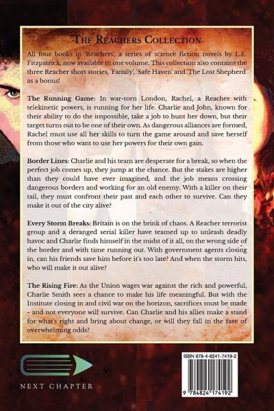 All four books in 'Reachers', a series of science fiction novels by L.E. Fitzpatrick, now available in one volume. This collection also contains the three Reacher short stories, 'Family', 'Safe Haven' and 'The Lost Shepherd' as a bonus! The Running Game: In war-torn London, Rachel, a Reacher with telekinetic powers, is running for her life. Charlie and John, known for their ability to do the impossible, take a job to hunt her down, but their target turns out to be one of their own. As dangerous alliances are formed, Rachel must use all her skills to turn the game around and save herself from those who want to use her powers for their own gain. Border Lines: Charlie and his team are desperate for a break, so when the perfect job comes up, they jump at the chance. But the stakes are higher than they could have ever imagined, and the job means crossing dangerous borders and working for an old enemy. With a killer on their tail, they must confront their past and each other to survive. Can they make it out of the city alive? Every Storm Breaks: Britain is on the brink of chaos. A Reacher terrorist group and a deranged serial killer have teamed up to unleash deadly havoc and Charlie finds himself in the midst of it all, on the wrong side of the border and with time running out. With government agents closing in, can his friends save him before it's too late? And when the storm hits, who will make it out alive? The Rising Fire: As the Union wages war against the rich and powerful, Charlie Smith sees a chance to make his life meaningful. But with the Institute closing in and civil war on the horizon, sacrifices must be made - and not everyone will survive. Can Charlie and his allies make a stand for what's right and bring about change, or will they fall in the face of overwhelming odds?