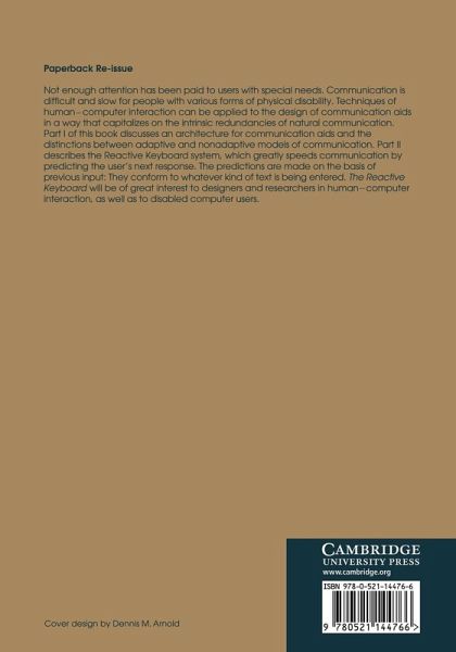 For people with various forms of physical disability, extreme slowness of communication is commonplace. In the first part of this 1992 book a functional architecture for communication aids is discussed and the idea of automatically supplying the intrinsic redundancy contained in natural communication is explained. The distinctions between adaptive and non-adaptive models of communication are shown and details are given of working predictive text generation systems. One such system is the Reactive Keyboard, and in the second part of the book this is described. It greatly speeds communication by predicting the user's next response, although it does not always predict correctly. The guesses are made on the basis of previous answers and thus can conform to whatever kind of text is entered. This will be of great value to all involved in helping disabled users interact with computers.