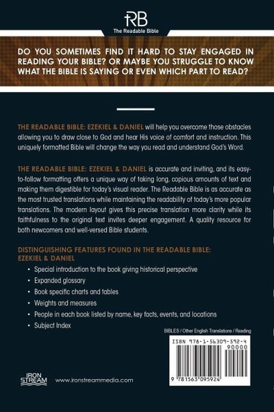 Do you sometimes find it hard to stay engaged in reading your Bible? Or maybe you struggle to know what the Bible is saying or even which part to read? The Readable Bible: Ezekiel & Daniel will help you overcome those obstacles allowing you to draw close to God and hear His voice of comfort and instruction. This uniquely formatted Bible will change the way you read and understand God's Word. The Readable Bible: Ezekiel & Daniel is accurate and inviting, and it's easy-to-follow formatting offers a unique way of taking long, copious amounts of text and making them digestible for today's visual reader. The Readable Bible is as accurate as the most trusted translations while maintaining the readability of today's more popular translations. The modern layout gives this precise translation more clarity while it's faithfulness to the original text invites deeper engagement. A quality resource for both newcomers and well-versed Bible students. Distinguishing features found in The Readable Bible: Ezekiel & Daniel - Special introduction to the book giving historical perspective - Expanded glossary - Book specific charts and tables - Weights and measures - People in each book listed by name, key facts, events, and locations - Subject Index Experience the God of the Bible like never before. Experience The Readable Bible.