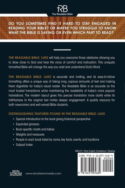 Do you sometimes find it hard to stay engaged in reading your Bible? Or maybe you struggle to know what the Bible is saying or even which part to read? The Readable Bible: Luke will help you overcome those obstacles allowing you to draw close to God and hear His voice of comfort and instruction. This uniquely formatted Bible will change the way you read and understand God's Word. The Readable Bible: Luke is accurate and inviting, and it's easy-to-follow formatting offers a unique way of taking long, copious amounts of text and making them digestible for today's visual reader. The Readable Bible is as accurate as the most trusted translations while maintaining the readability of today's more popular translations. The modern layout gives this precise translation more clarity while it's faithfulness to the original text invites deeper engagement. A quality resource for both newcomers and well-versed Bible students. Distinguishing features found in The Readable Bible: Luke - Special introduction to the book giving historical perspective - Expanded glossary - Book specific charts and tables - Weights and measures - People in each book listed by name, key facts, events, and locations - Subject Index Experience the God of the Bible like never before. Experience The Readable Bible.