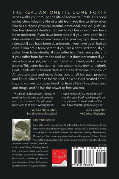 The Real Antonette Come Forth series walks you through the life of Antonette Smith. This book series chronicles the life of a girl from age five to thirty-nine. She has suffered physical, mental, emotional, and drug abuse. She has cheated death and lived to tell her story. If you have been molested, if you have been raped, if you have been in an abusive relationship, if you have run for your life, if you have been rejected, if you have been abandoned, if you have been looked over, if you are a teen parent, if you are a confused teen, if you suffer from false identity, if you suffer from hurt and pain, and if you suffer from heartache and pain, it does not matter if you are a boy or a girl, man or woman—hurt is hurt, and shame is shame. This series has been written to shame the devil and glorify God. It tells all the hidden dark secrets to dethrone the devil of Antonette’s past and make Jesus Lord of all her past, present, and future. She’s free to be the real her, who God created her to be, and you are too. Jesus freed her from a life of lies, abuse, sex, and drugs, and he has the power to free you too. "This book is about truth. When im reading, it takes me to where you are. I can just see it. People want truth, real stuff. Keep writing truth." — Verdice McClendon ,Brookhaven Mississippi. "I dont know if you realize this of not. But your book reach people on many levels. From all walks of life. You have something for everyone." — Lacie Carpenter, McComb,Mississippi.