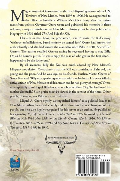 Miguel Antonio Otero served as the first Hispanic governor of the U.S. Territory of New Mexico, from 1897 to 1906. He was appointed to the office by President William McKinley. Long after his retirement from politics, Governor Otero wrote and published his memoirs in three volumes, a major contribution to New Mexico history. But he also published a biography in 1936 titled "The Real Billy the Kid." His aim in that book, he proclaimed, was to write the Kid's story "without embellishment, based entirely on actual fact." Otero had known the outlaw briefly and also had known the man who killed Billy in 1881, Sheriff Pat Garrett. The author recalled Garrett saying he regretted having to slay Billy. Or, as he bluntly put it, "it was simply the case of who got in the first shot. I happened to be the lucky one." By all accounts, Billy the Kid was much adored by New Mexico's Hispanic population. Otero asserts that the Kid was considerate of the old, the young and the poor. And he was loyal to his friends. Further, Martin Cháves of Santa Fe stated: "Billy was a perfect gentleman with a noble heart. He never killed a native citizen of New Mexico in all his career, and he had plenty of courage." Otero was especially admiring of Billy because as a boy in Silver City, "he had loved his mother devotedly." Such praise must be viewed in the context of the times. Other people, of course, saw Billy as an arch-villain. Miguel A. Otero rightly distinguished himself as a political leader in New Mexico where he raised a family and lived out his life as a champion of the people, but he is also highly recognized for his career as an author. He published his legendary "My Life on the Frontier, 1864-1882" in 1935, followed by "The Real Billy the Kid: With New Light on the Lincoln County War" in 1936, "My Life on the Frontier, 1882-1897" in 1939, and "My Nine Years as Governor of New Mexico Territory, 1897-1906" in 1940.
