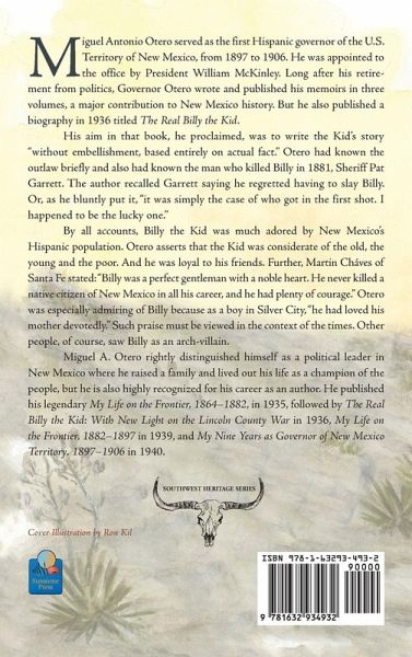 Miguel Antonio Otero served as the first Hispanic governor of the U.S. Territory of New Mexico, from 1897 to 1906. He was appointed to the office by President William McKinley. Long after his retirement from politics, Governor Otero wrote and published his memoirs in three volumes, a major contribution to New Mexico history. But he also published a biography in 1936 titled "The Real Billy the Kid." His aim in that book, he proclaimed, was to write the Kid's story "without embellishment, based entirely on actual fact." Otero had known the outlaw briefly and also had known the man who killed Billy in 1881, Sheriff Pat Garrett. The author recalled Garrett saying he regretted having to slay Billy. Or, as he bluntly put it, "it was simply the case of who got in the first shot. I happened to be the lucky one." By all accounts, Billy the Kid was much adored by New Mexico's Hispanic population. Otero asserts that the Kid was considerate of the old, the young and the poor. And he was loyal to his friends. Further, Martin Cháves of Santa Fe stated: "Billy was a perfect gentleman with a noble heart. He never killed a native citizen of New Mexico in all his career, and he had plenty of courage." Otero was especially admiring of Billy because as a boy in Silver City, "he had loved his mother devotedly." Such praise must be viewed in the context of the times. Other people, of course, saw Billy as an arch-villain. Miguel A. Otero rightly distinguished himself as a political leader in New Mexico where he raised a family and lived out his life as a champion of the people, but he is also highly recognized for his career as an author. He published his legendary "My Life on the Frontier, 1864-1882" in 1935, followed by "The Real Billy the Kid: With New Light on the Lincoln County War" in 1936, "My Life on the Frontier, 1882-1897" in 1939, and "My Nine Years as Governor of New Mexico Territory, 1897-1906" in 1940.