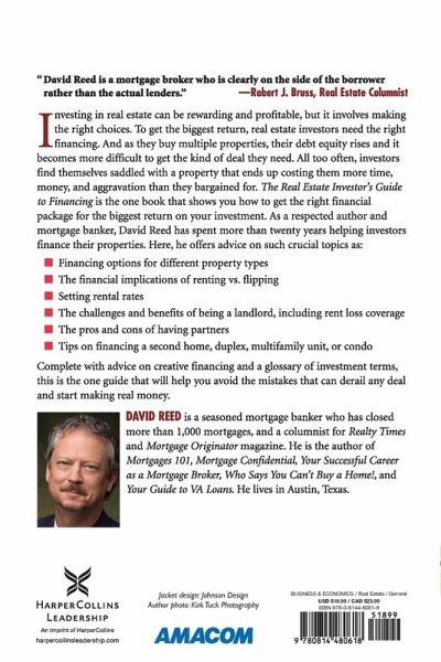 To get the biggest return, real estate investors need the right financing. And as they buy multiple properties, their debt to equity rises, making it more difficult to get the kind of deal they need. As many investors have learned the hard way, getting the wrong financing can wipe out their profits, hold them back from selling because of a lack of equity, or force them to try to sell for more than the market will bear. The Real Estate Investor's Guide to Financing is the one book that shows readers how to get the right financial package for the biggest return on their investment. As a respected author and mortgage banker, David Reed has spent more than 20 years helping investors finance their properties. Here, he offers advice on such crucial topics as: * financing options for different property types * the financial implications of renting vs. flipping * setting rental rates * the challenges and benefits of being a landlord, including rent loss coverage * the pros and cons of having partners * tips on financing a second home, duplex, multi-family unit, or condo Complete with essential advice on financing and a glossary of investment terms, this is the one guide that will help readers start making real money.