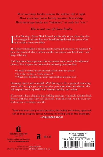 In Real Marriage, Pastor Mark Driscoll and his wife, Grace, share how they have struggled and how they have found healing through the power of the only reliable source: the Bible. They believe friendship is fundamental to marriage but not easy to maintain. They offer practical advice on how to make your spouse your best friend and keep it that way.