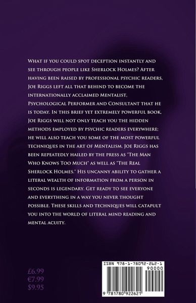 What if you could spot deception instantly and see through people like Sherlock Holmes? After having been raised by professional psychic readers, Joe Riggs left all that behind to become the internationally acclaimed Mentalist, Psychological Performer and Consultant that he is today. In this brief yet extremely powerful book, Joe Riggs will not only teach you the hidden methods employed by psychic readers everywhere; he will also teach you some of the most powerful techniques in the art of Mentalism. Joe Riggs has been repeatedly hailed by the press as "The Man Who Knows Too Much" as well as "The Real Sherlock Holmes." His uncanny ability to gather a literal wealth of information from a person in seconds is legendary. Get ready to see everyone and everything in a way you never thought possible. These skills and techniques will catapult you into the world of literal mind reading and mental acuity.