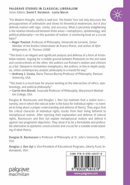 Douglas B. Rasmussen and Douglas J. Den Uyl maintain that a realist turn-namely, one in which the natural order is the basis for individual rights-is needed to bring about a proper understanding and defense of liberty. They argue that the critical character of individual rights results from their being tethered to metaphysical realism. After reprising their explanation and defense of natural rights, Rasmussen and Den Uyl explain metaphysical realism and defend it against neo-pragmatist objections. They show it to be a formidable and preferable alternative to epistemic constructivism and crucial for a suitable understanding of ideal theory.