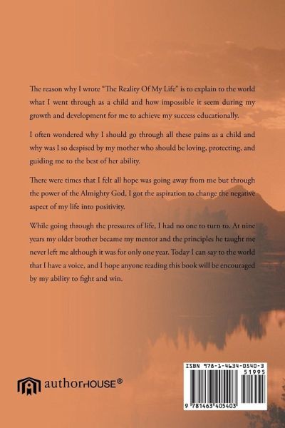 The reason why I wrote "The Reality Of My Life" is to explain to the world what I went through as a should and how impossible it seem during my growth and development for me to achieve my success educationally. I often wondered why I should go through all these pains as a child and why was I so despised by my mother who should be loving, protecting, and guiding me to the best of her ability. There were times that I felt all hope was going away from me but through the power of the Almighty God, I got the aspiration to change the negative aspect of my life into positivity. While going through the pressures of life, I had no to turn to. At nine years my older brother became my mentor and the principles he taught me never left me although it was for only one year. Today I can say to the world that I have a voice, and I hope anyone will be encouraged by my ability to fight and win.