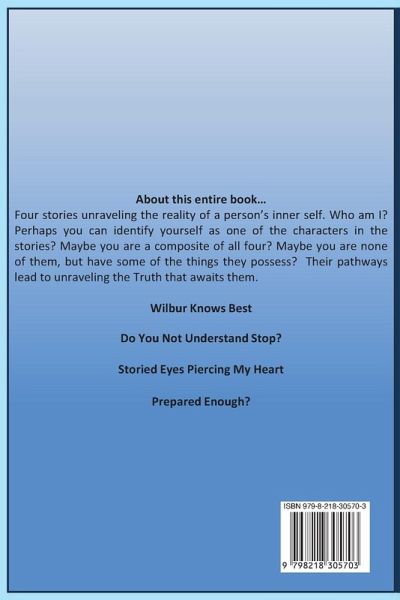 About this entire book... Four stories unraveling the reality of a person's inner self. Who am I? Perhaps you can identify yourself as one of the characters in the stories? Maybe you are a composite of all four? Maybe you are none of them, but have some of the things they possess? Their pathways lead to unraveling the Truth that awaits them. I. Wilbur Knows Best This is the heart-rendering story of Wilbur, a man of deep insight, who shares his life stories with candor and passion. Beginning from his birth, Wilbur recounts his bodily struggles, his foibles and successes through his early childhood, adolescence, and adulthood. He offers perspective on his different experiences, but is never really sure about the source of knowledge and strength he receives to understand and make sense of those experiences. As a young man, Wilbur has a personal epiphany that leads him to a close and personal relationship that helps him to understand his dysfunction. That revelation then points him into the direction of hope, peace and grace extending into eternity. He shares his memoirs with the world because Wilbur Knows Best! II. Do You Not Understand Stop? Sometimes a word is overused to the point that the meaning of it becomes lost. "STOP" is one of those words which has lost impact and significance today. Often, our ears fail to heed the warning the word alerts us to. Ignoring it, we make choices that best suit our self-interest resulting in lost opportunities, or inflicting judgement that yields startling consequences when "STOP" is not heeded III.Storied Eyes Piercing My Heart There are hidden stories behind the eyes of every person. The author uses a special framework to understand the nature of humanity. So desperately wanting to understand more of those stories he fabricates them to ease his yearning deep in his heart. He realizes that he must do more than imagine them. He must live and reveal the Truth. IV.Prepared Enough? Survival at all cost! How much does one need to do to be prepared for the extremes of the wilderness? Is it enough? What is missing? What is the real Truth for survival?