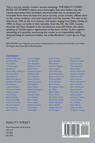 This is not just another modern sonnet anthology. THE REALITY STREET BOOK OF SONNETS delves more thoroughly than ever before into the myriad ways poets have stretched, deconstructed and re-composed the venerable form: here we have free-verse sonnets, prose sonnets, offbeat takes on the sonnet tradition, and even visual and concrete sonnets. We take as our time frame 1945 to the 21st century, with poets ranging from Edwin Denby (b. 1903) to those currently in their twenties, from the UK, the USA, Canada, Australia and New Zealand. In his introductory essay Jeff Hilson, the editor, speaking of Ted Berrigan's regeneration of the form, writes: 'It also registers something of a paradox, announcing the sonnet as an impossibility whilst demonstrating its continued vitality, not unlike Beckett's "I can't go on, I'll go on."'