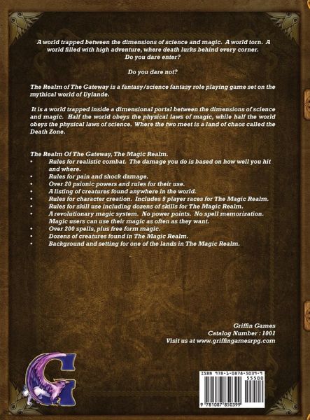 A world trapped between the dimensions of science and magic. A world torn. A world filled with high adventure, where death lurks behind every corner. Do you dare enter? Do you dare not? The Realm of The Gateway is a fantasy/science fantasy role playing game set on the mythical world of Uylande. It is a world trapped inside a dimensional portal between the dimensions of science and magic. Half the world obeys the physical laws of magic, while half the world obeys the physical laws of science. Where the two meet is a land of chaos called the Death Zone. The Realm Of The Gateway, The Magic Realm. • Rules for realistic combat. The damage you do is based on how well you hit and where. • Rules for pain and shock damage. • Over 20 psionic powers and rules for their use. • A listing of creatures found anywhere in the world. • Rules for character creation. Includes 9 player races for The Magic Realm. • Rules for skill use including dozens of skills for The Magic Realm. • A revolutionary magic system. No power points. No spell memorization. Magic users can use their magic as often as they want. • Over 200 spells, plus free form magic. • Dozens of creatures found in The Magic Realm. • Background and setting for one of the lands in The Magic Realm. The Realm of the Gateway: The Magic Realm is the first in a series of books for The Realm of the Gateway. The Science Realm and The Death Zone will be coming soon! In addition we will be releasing guidebooks for each realm.
