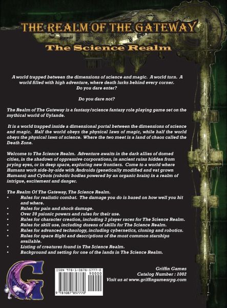 A world trapped between the dimensions of science and magic. A world torn. A world filled with high adventure, where death lurks behind every corner. Do you dare enter? Do you dare not? The Realm of The Gateway is a fantasy/science fantasy role playing game set on the mythical world of Uylande. It is a world trapped inside a dimensional portal between the dimensions of science and magic. Half the world obeys the physical laws of magic, while half the world obeys the physical laws of science. Where the two meet is a land of chaos called the Death Zone. Welcome to The Science Realm. Adventure awaits in the dark allies of domed cities, in the shadows of oppressive corporations, in ancient ruins hidden from prying eyes, or in deep space, exploring new frontiers. Come to a world where Humans work side-by-side with Androids, genetically modified and vat grown Humans, and Cybots, robotic bodies powered by an organic brain.