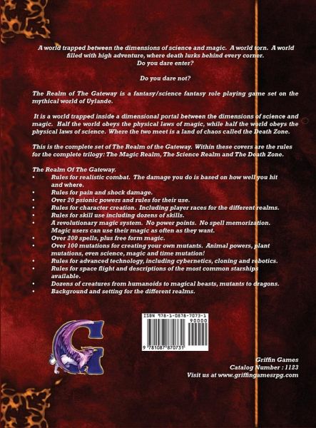 A world trapped between the dimensions of science and magic. A world torn. A world filled with high adventure, where death lurks behind every corner. Do you dare enter? Do you dare not? The Realm of The Gateway is a fantasy/science fantasy role playing game set on the mythical world of Uylande. It is a world trapped inside a dimensional portal between the dimensions of science and magic. Half the world obeys the physical laws of magic, while half the world obeys the physical laws of science. Where the two meet is a land of chaos called the Death Zone. This is the complete set of The Realm of the Gateway. Within these covers are the rules for the complete trilogy: The Magic Realm, The Science Realm and The Death Zone. The Realm Of The Gateway. • Rules for realistic combat. The damage you do is based on how well you hit and where. • Rules for pain and shock damage. • Over 20 psionic powers and rules for their use. • Rules for character creation. Including player races for the different realms. • Rules for skill use including dozens of skills. • A revolutionary magic system. No power points. No spell memorization. Magic users can use their magic as often as they want. • Over 200 spells, plus free form magic. • Over 100 mutations for creating your own mutants. Animal powers, plant mutations, even science, magic and time mutation! • Rules for advanced technology, including cybernetics, cloning and robotics. • Rules for space flight and descriptions of the most common starships available. • Dozens of creatures from humanoids to magical beasts, mutants to dragons. • Background and setting for the different realms.