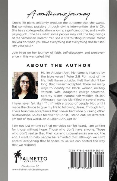 Kree's life plans seldomly produce the outcome that she wants. But somehow, possibly through divine intervention, she is OK. She has a college education, a loving significant other, and a well-paying job. She has, what some people may call, the beginnings of the "American Dream". Yet, she is still thirsting for more. What do you do when you have everything but everything doesn't satisfy your soul? ¿Join Kree on her journey of faith, self-discovery, and perseverance in this war called life!