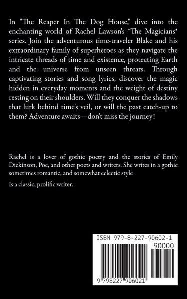 In "The Reaper In The Dog House," dive into the enchanting world of Rachel Lawson's *The Magicians* series. Join the adventurous time-traveler Blake and his extraordinary family of superheroes as they navigate the intricate threads of time and existence, protecting Earth and the universe from unseen threats. Through captivating stories and song lyrics, discover the magic hidden in everyday moments and the weight of destiny resting on their shoulders. Will they conquer the shadows that lurk behind time's veil, or will the past catch-up to them? Adventure awaits-don't miss the journey!