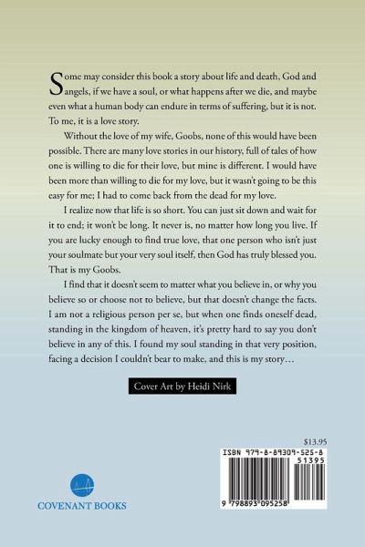 Some may consider this book a story about life and death, God and angels, if we have a soul, or what happens after we die, and maybe even what a human body can endure in terms of suffering, but it is not. To me, it is a love story. Without the love of my wife, Goobs, none of this would have been possible. There are many love stories in our history, full of tales of how one is willing to die for their love, but mine is different. I would have been more than willing to die for my love, but it wasn't going to be this easy for me; I had to come back from the dead for my love. I realize now that life is so short. You can just sit down and wait for it to end; it won't be long. It never is, no matter how long you live. If you are lucky enough to find true love, that one person who isn't just your soulmate but your very soul itself, then God has truly blessed you. That is my Goobs. I find that it doesn't seem to matter what you believe in, or why you believe so or choose not to believe, but that doesn't change the facts. I am not a religious person per se, but when one finds oneself dead, standing in the kingdom of heaven, it's pretty hard to say you don't believe in any of this. I found my soul standing in that very position, facing a decision I couldn't bear to make, and this is my story...