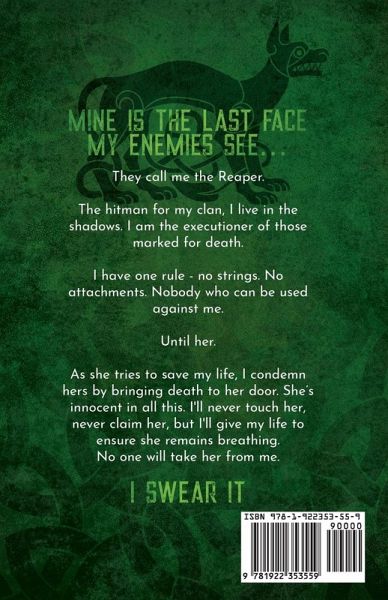 Mine is the last face my enemies see... They call me the Reaper. The hitman for my clan, I live in the shadows. I am the executioner of those marked for death. I have one rule - no strings. No attachments. Nobody who can be used against me. Until her. As she tries to save my life, I condemn hers by bringing death to her door. She's innocent in all this. I'll never touch her, never claim her, but I'll give my life to ensure she remains breathing. No one will take her from me. I swear it.