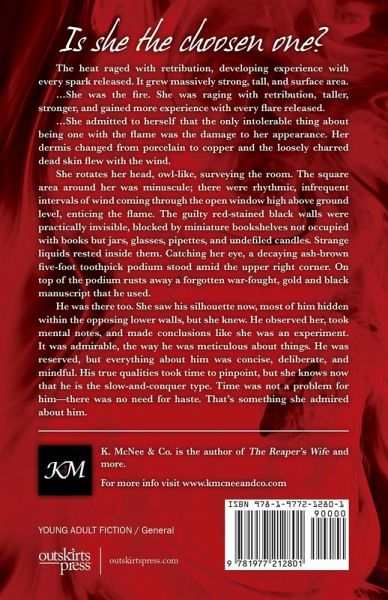 Is she the choosen one? The heat raged with retribution, developing experience with every spark released. It grew massively strong, tall, and surface area. ...She was the fire. She was raging with retribution, taller, stronger, and gained more experience with every flare released. ...She admitted to herself that the only intolerable thing about being one with the flame was the damage to her appearance. Her dermis changed from porcelain to copper and the loosely charred dead skin flew with the wind. She rotates her head, owl-like, surveying the room. The square area around her was minuscule; there were rhythmic, infrequent intervals of wind coming through the open window high above ground level, enticing the flame. The guilty red-stained black walls were practically invisible, blocked by miniature bookshelves not occupied with books but jars, glasses, pipettes, and undefiled candles. Strange liquids rested inside them. Catching her eye, a decaying ash-brown five-foot toothpick podium stood amid the upper right corner. On top of the podium rusts away a forgotten war-fought, gold and black manuscript that he used. He was there too. She saw his silhouette now, most of him hidden within the opposing lower walls, but she knew. He observed her, took mental notes, and made conclusions like she was an experiment. It was admirable, the way he was meticulous about things. He was reserved, but everything about him was concise, deliberate, and mindful. His true qualities took time to pinpoint, but she knows now that he is the slow-and-conquer type. Time was not a problem for him--there was no need for haste. That's something she admired about him. K. McNee & Co is the author of The Reaper's Wife and more. For more info visit www.kmcneeandco.com