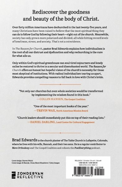 In The Reason for Church, Brad Edwards contends that over 40 million Americans have dechurched because individualism has exploited critical weaknesses in our discipleship. He describes some of the insidious ways it has infiltrated our churches and gives reasons to rediscover the truth, goodness, and beauty of Christâ s bride.