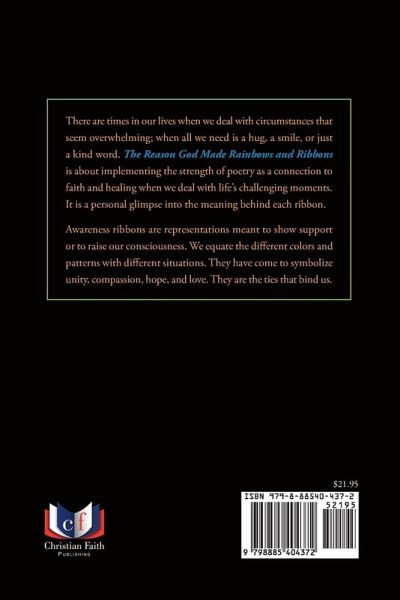 There are times in our lives when we deal with circumstances that seem overwhelming; when all we need is a hug, a smile, or just a kind word. The Reason God Made Rainbows and Ribbons is about implementing the strength of poetry as a connection to faith and healing when we deal with life's challenging moments. It is a personal glimpse into the meaning behind each ribbon. Awareness ribbons are representations meant to show support or to raise our consciousness. We equate the different colors and patterns with different situations. They have come to symbolize unity, compassion, hope, and love. They are the ties that bind us.