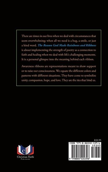 There are times in our lives when we deal with circumstances that seem overwhelming; when all we need is a hug, a smile, or just a kind word. The Reason God Made Rainbows and Ribbons is about implementing the strength of poetry as a connection to faith and healing when we deal with life's challenging moments. It is a personal glimpse into the meaning behind each ribbon. Awareness ribbons are representations meant to show support or to raise our consciousness. We equate the different colors and patterns with different situations. They have come to symbolize unity, compassion, hope, and love. They are the ties that bind us.